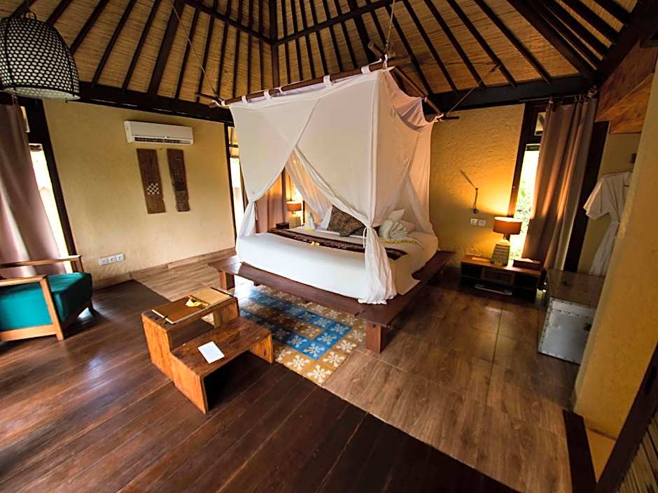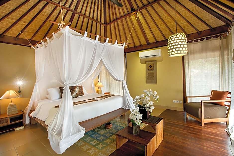 Featuring a private balcony overlooking the ocean, this spacious villa is fitted with air conditioning and a separate living area. It also comes with an outdoor traditional pavilion with direct access to the beach. The semi open bathroom is private, providing bath and shower facilities.